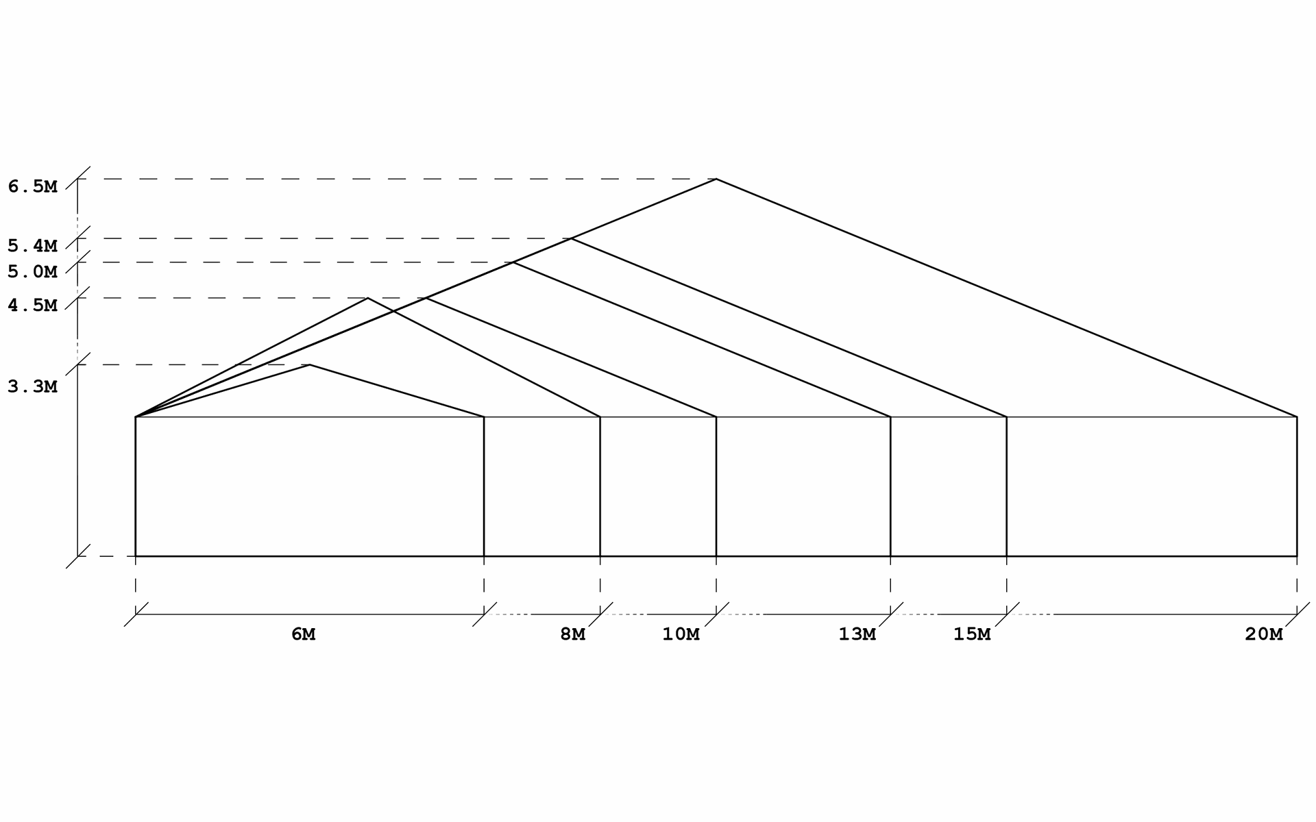 Leur largeur varient de 6m, 8m, 10m, 13m, 15m, 20m et 25m. Chacune de ces modules à une longueur de 3m ou 5m. (Un module de 3m ne peut etre monté qu'avec un module de 5m au minimum)
